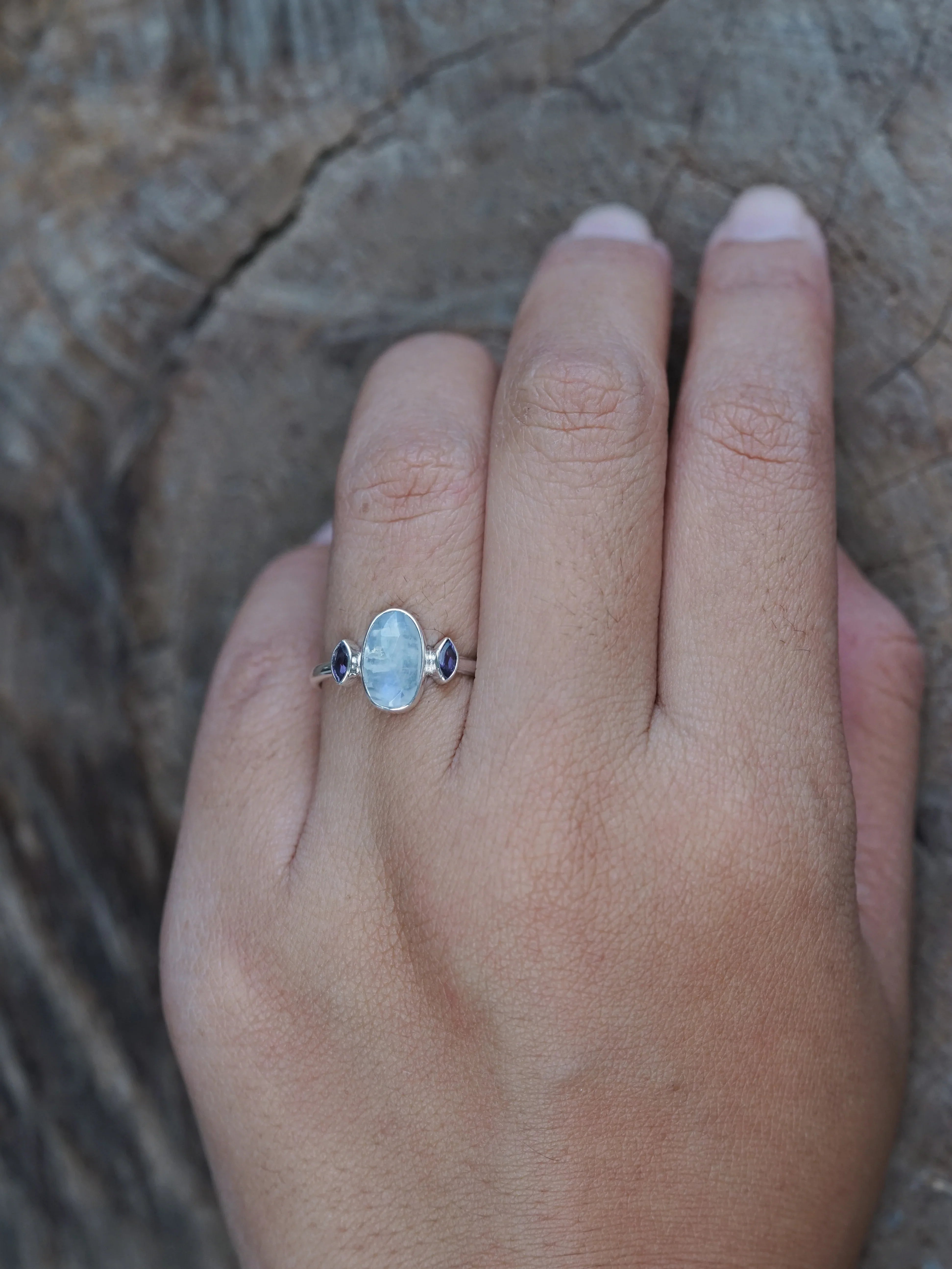 The oval moonstone sits at the center with a marquise cut amethyst on each side, framing the moonstone like guardians. Each gemstone is bezel set in recycled sterling silver.