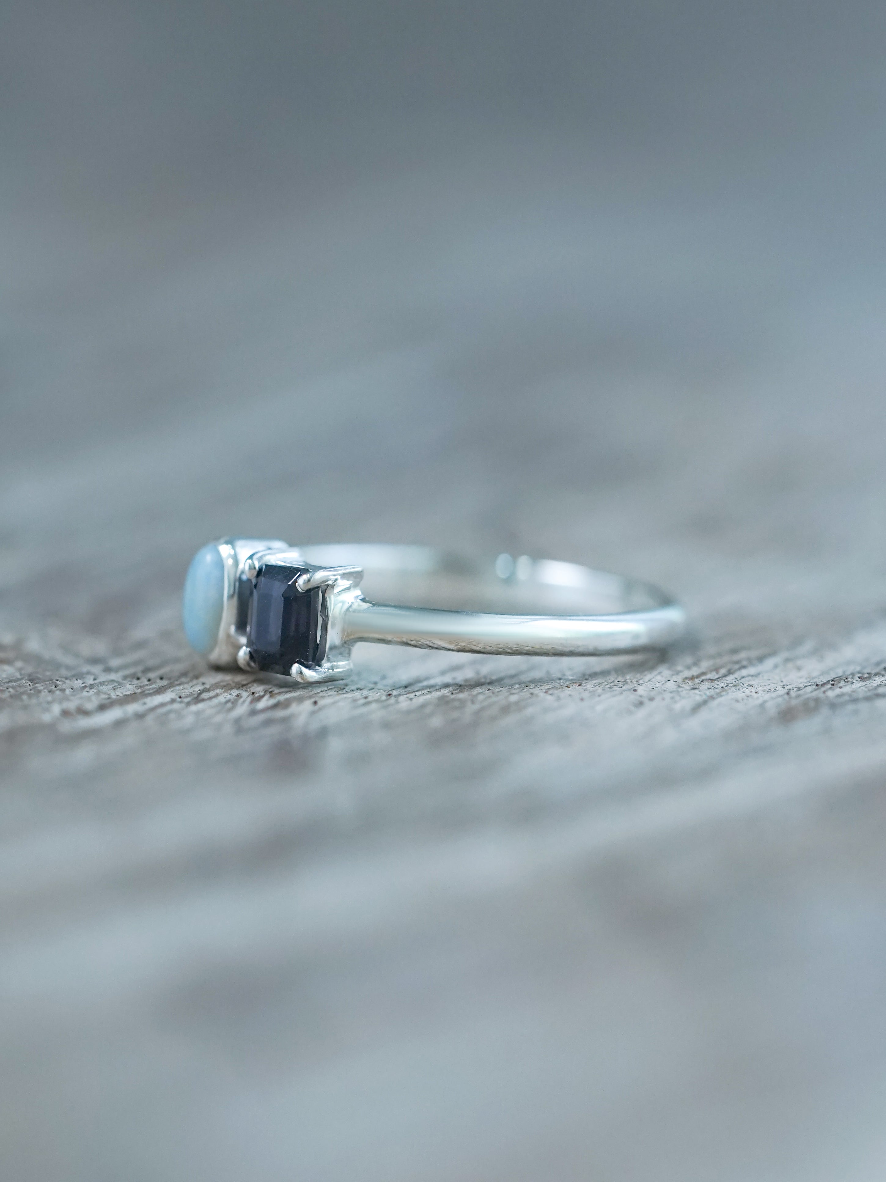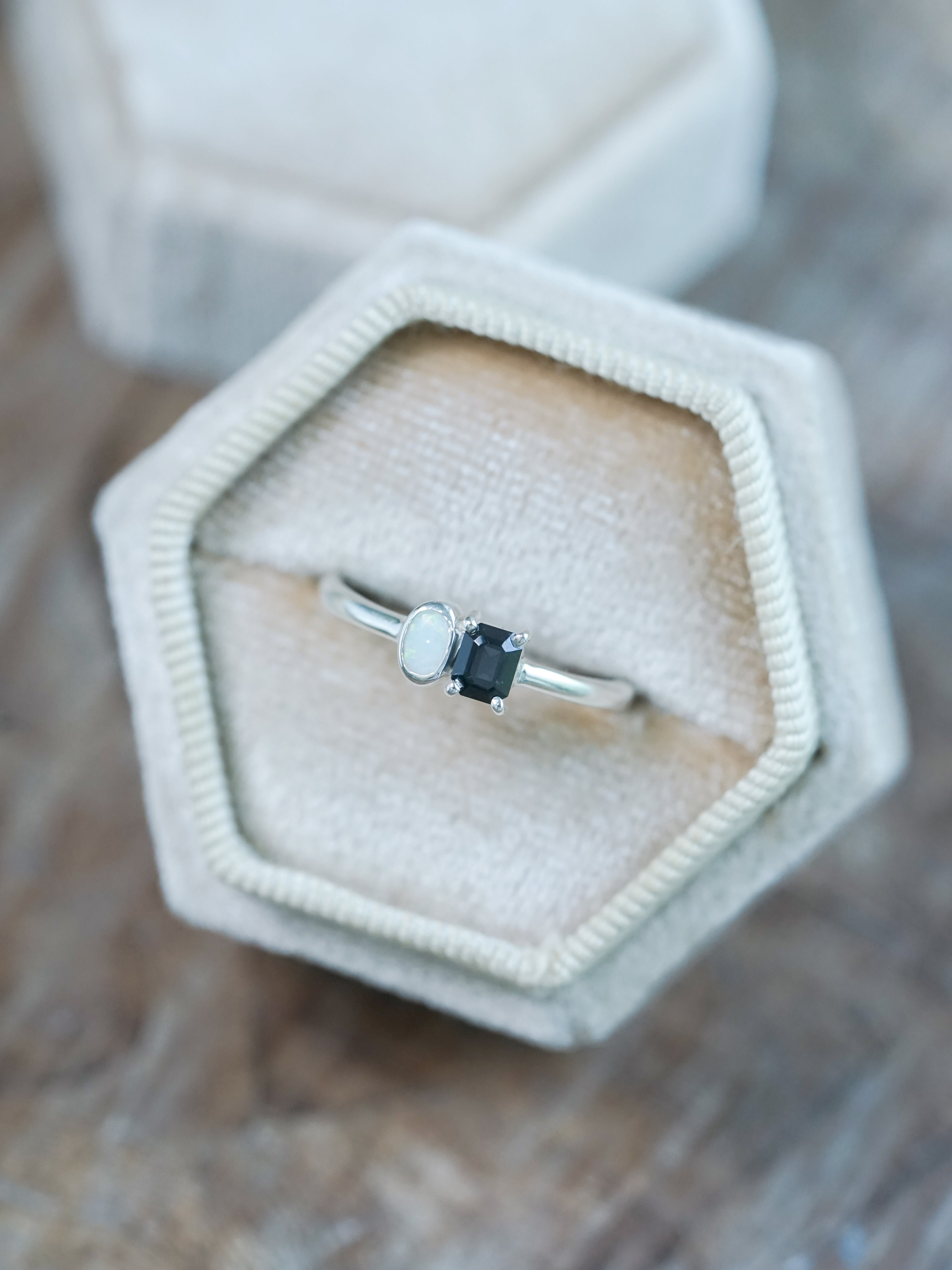 Set in recycled sterling silver, this ring pairs a solid oval opal from Australia with an emerald cut spinel from Mae Sai, Thailand. The opal is milky and luminous, catching flickers of color that shift with your every move. It's set in a bezel setting. The angular cut of the spinel anchors the ring with dark, steady power. It's set in prongs. Rounded meets angular, translucent meets opaque - a tension that holds its own harmony.