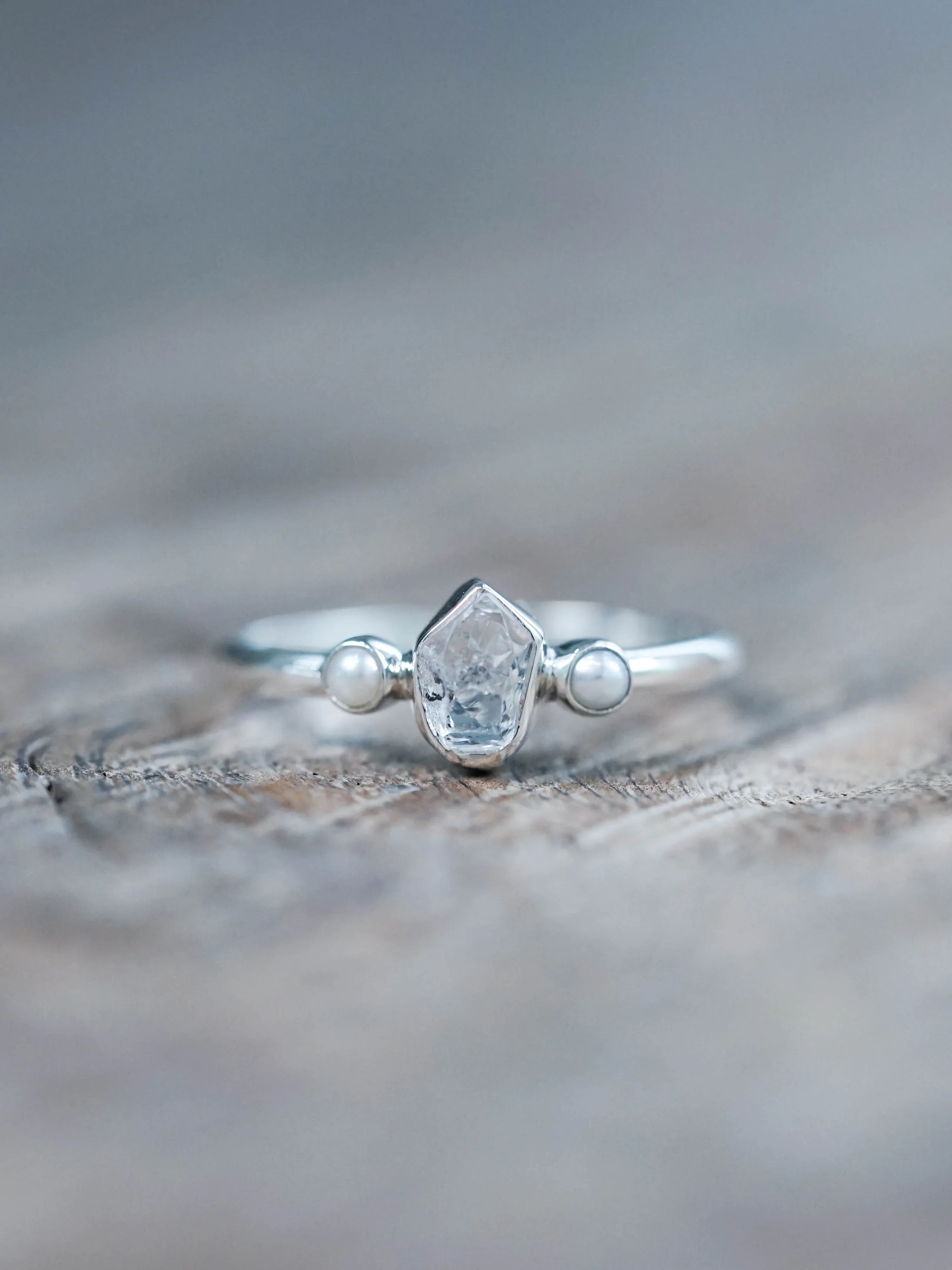 This Pearl and Herkimer Diamond Ring, alongside our Herkimer Diamond Earrings, will make a lovely addition to your wedding day look or as a bridesmaid gift.