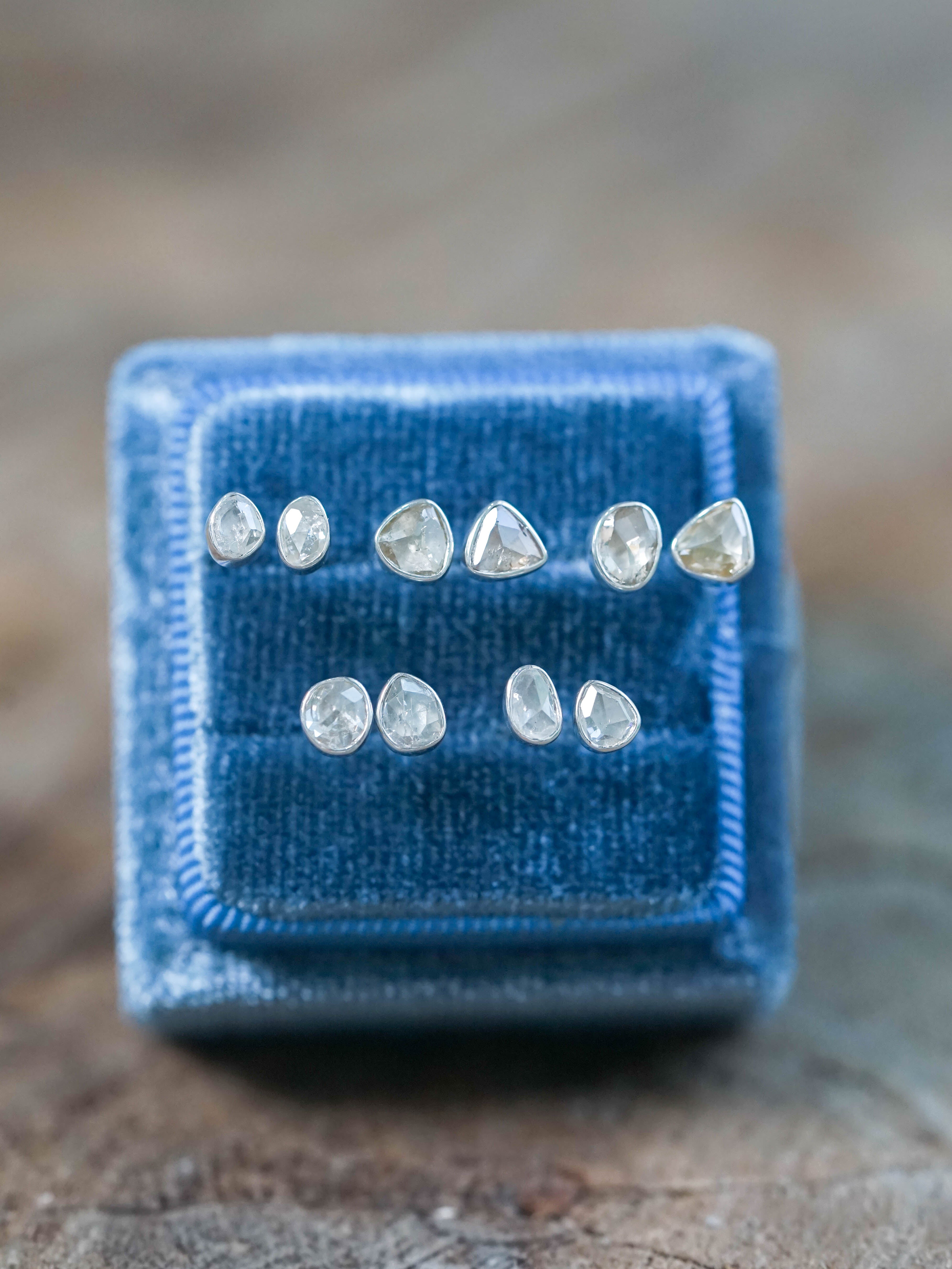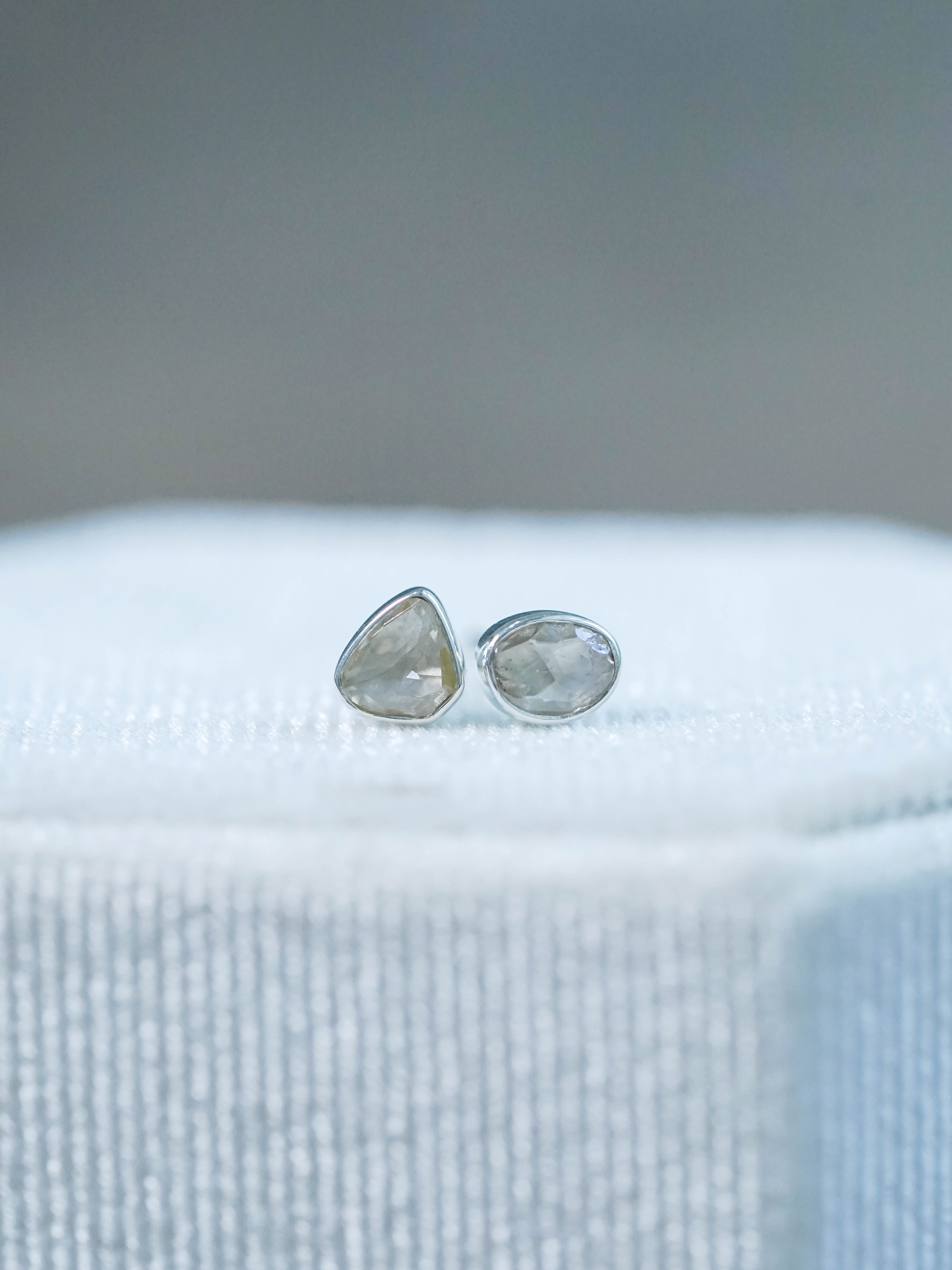 Set in recycled sterling silver, these mismatched silver diamond stud earrings are as ethical as they are original. They tell the story of every hand that touched them, every river they tumbled down and every person who chooses meaning over flawless.