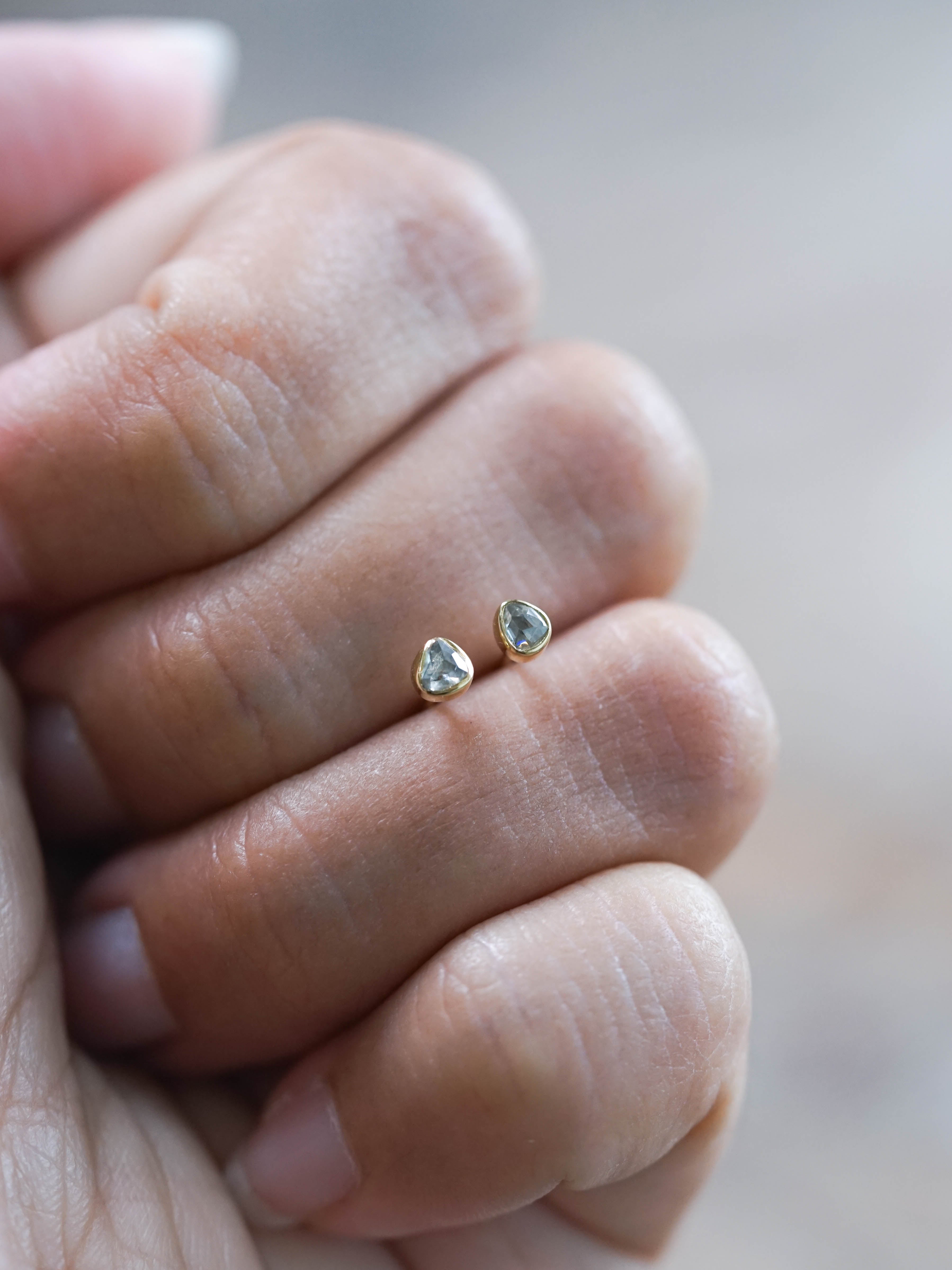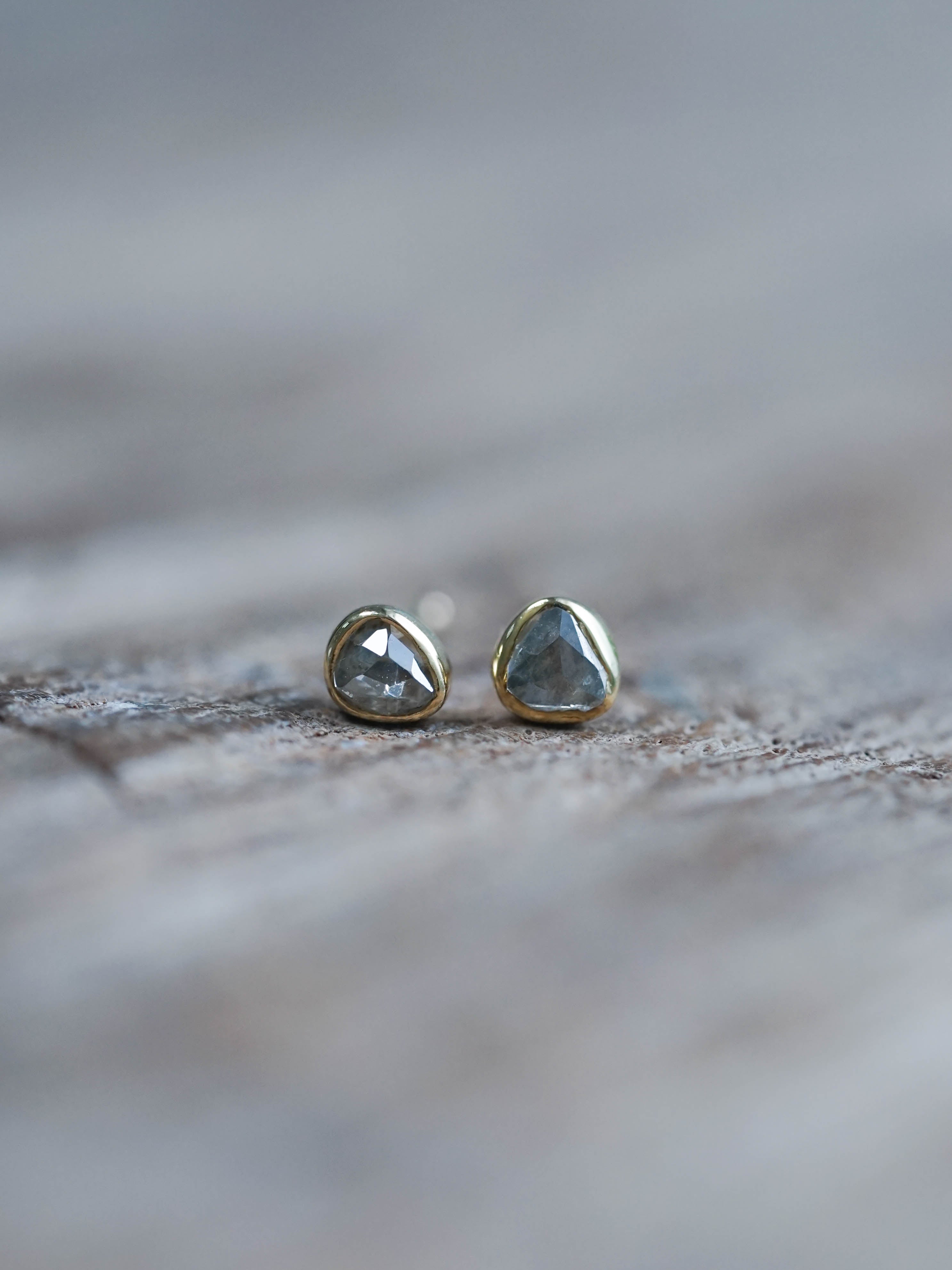A pair of rose cut diamond earrings that doesn't like to conform to rigid rules. Each diamond is rose cut and bezel set with a closed back, which makes the salt and pepper inclusions stand out even more. Inside each rose cut diamond, you’ll see specks, swirls, and inclusions, like galaxies in motion. No two stones are alike. They shimmer flecks or black and glimmers of light.