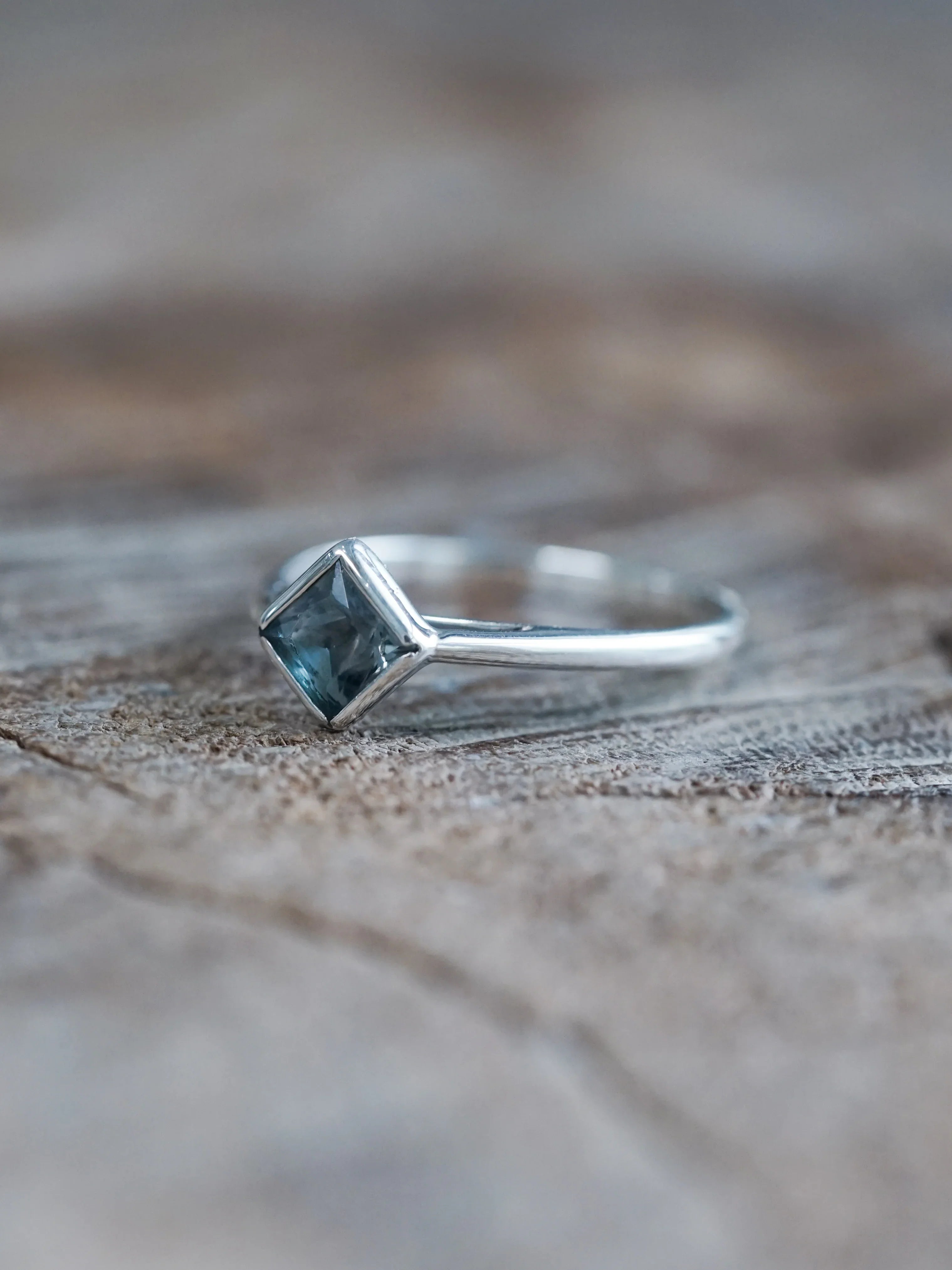 The princess cut sapphire from Sri Lanka sits square and centered, heated to bring out its blue color. The bezel setting wraps around the girdle and opens on the sides, letting light pass through and move across the facets. Recycled sterling silver frames the blue sapphire.