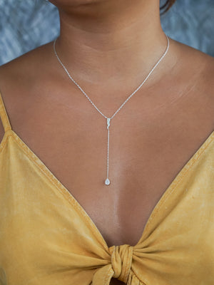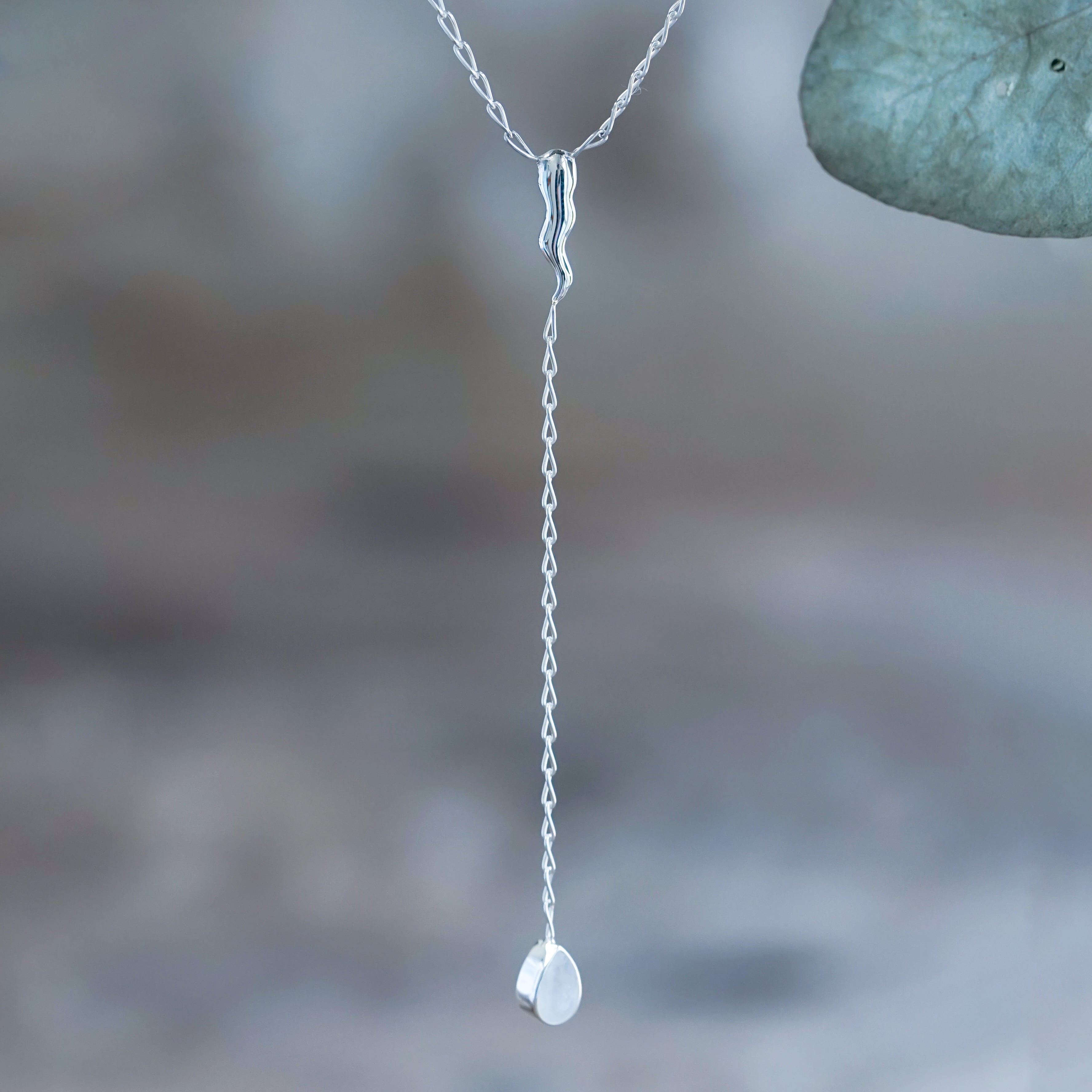 At your collarbone, a softened flash of silver. A thunderbolt shaped like water in motion, more flow than strike. From its tip, a long, delicate chain draws the eye down, ending in a pear-shaped moonstone that rests just at the edge of your heartbeat.