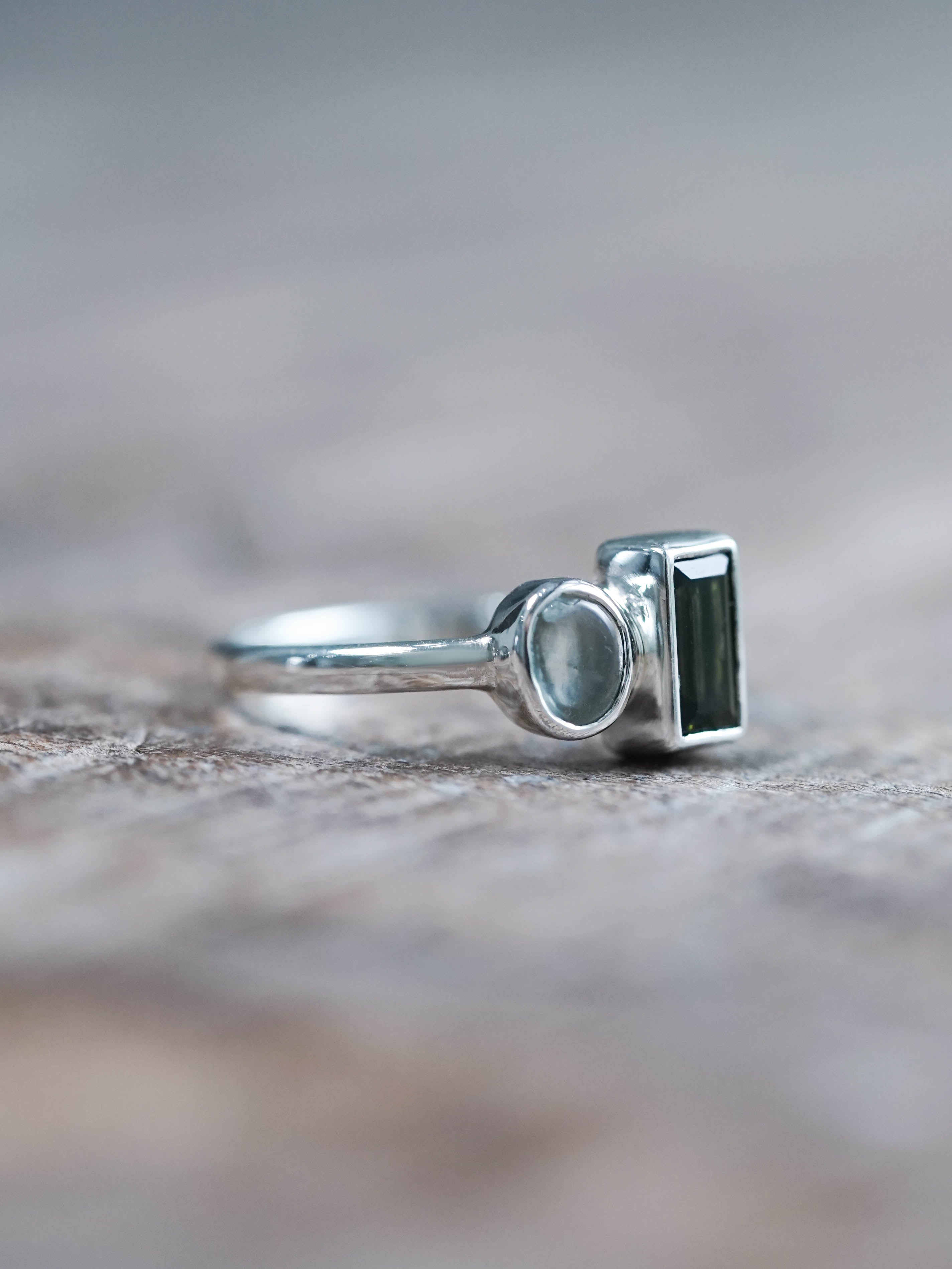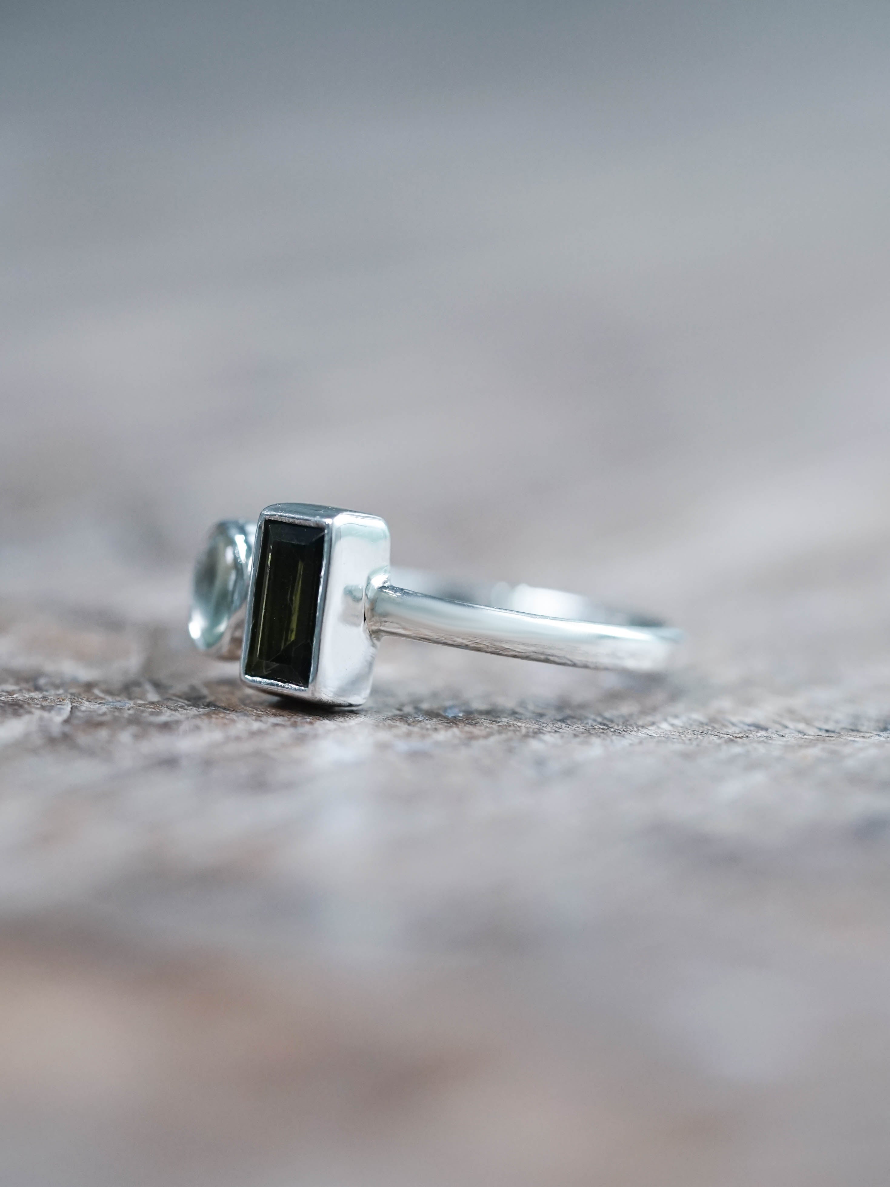 Green Tourmaline and Prehnite Ring sits on your hand like a riddle. Baguette cut tourmaline holds steady, all sharp lines and green depth. Cabochon prehnite presses in beside it, ready to catch the next thought before it flies away or hides under the couch.