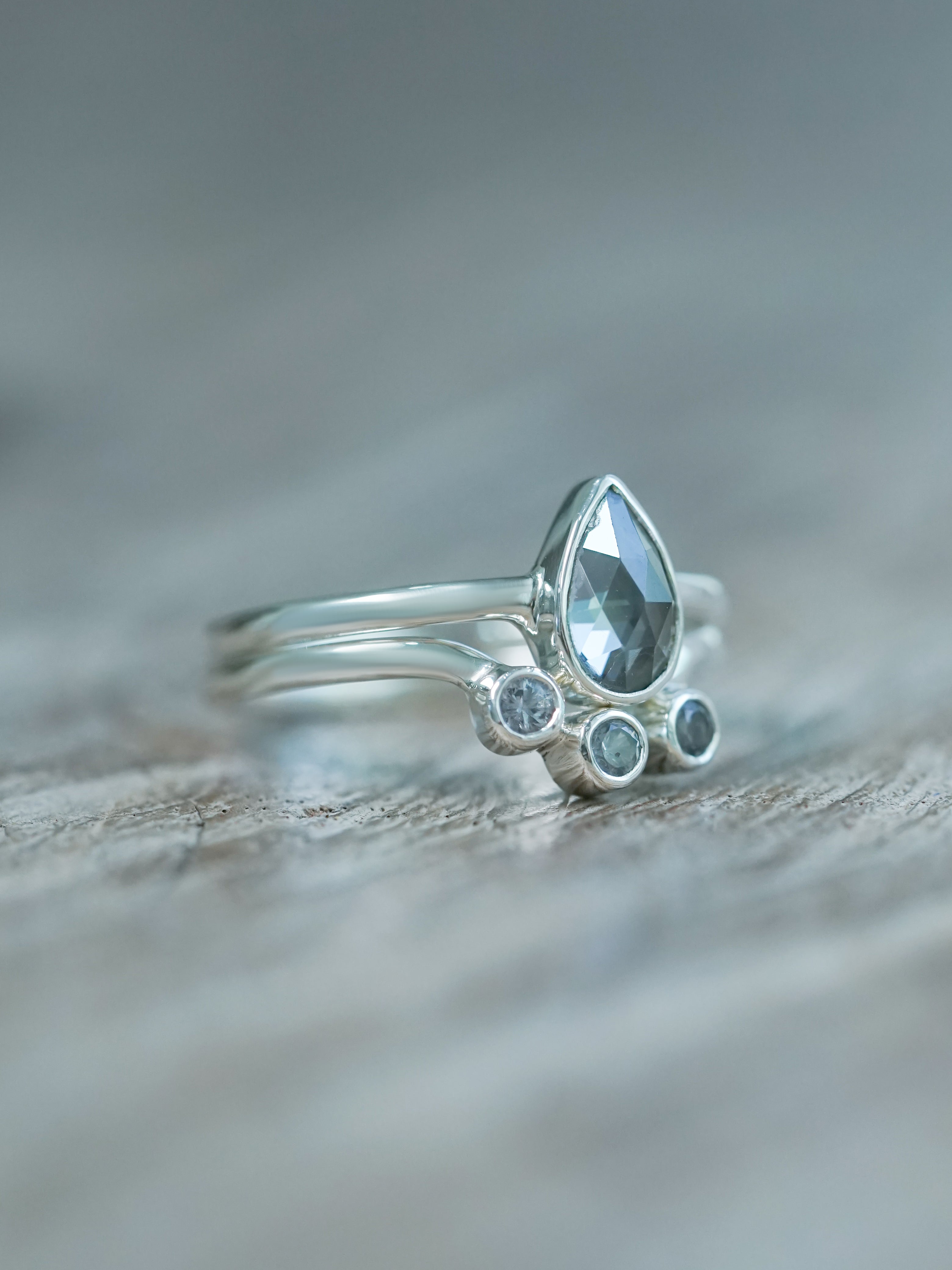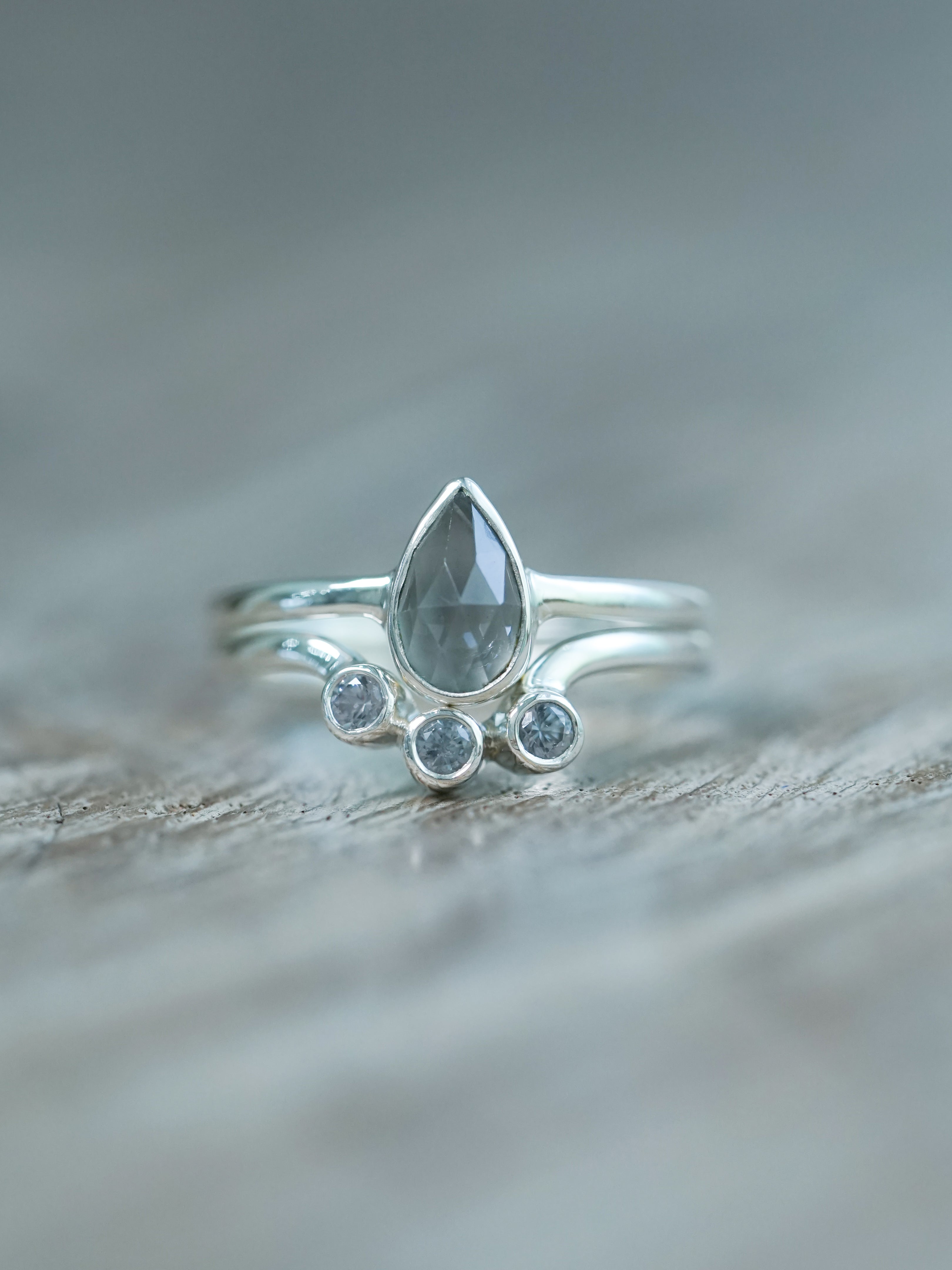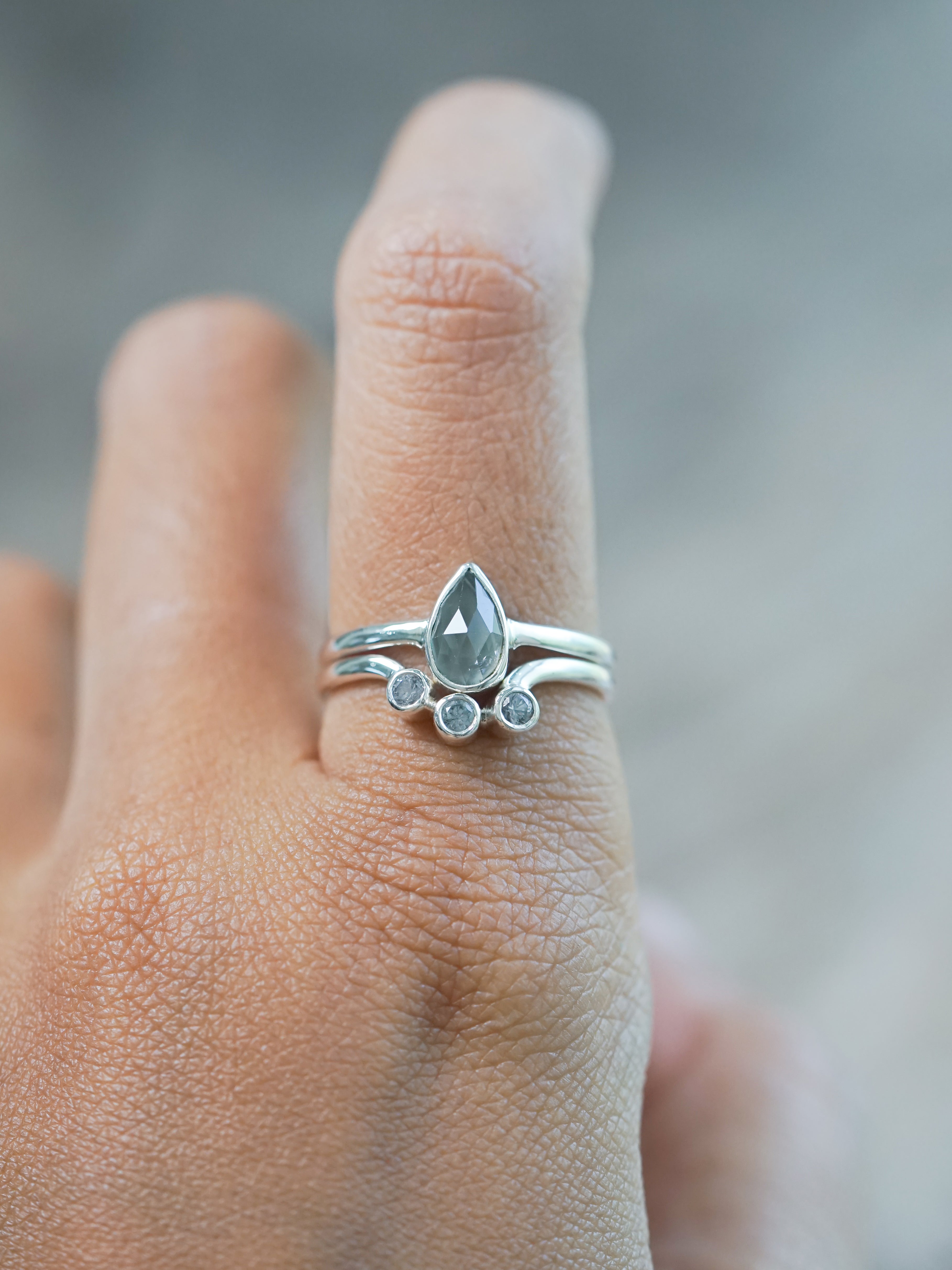 A pear shaped tourmaline sits at the center of the main ring, rose cut to catch just enough light. It’s a soft, grounded gray: steady, unflashy, and full of feeling. It nests with a curved silver spinel ring with three round spinels that shimmer like rain on stone. Both are bezel set in recycled sterling silver for a clean, modern look.