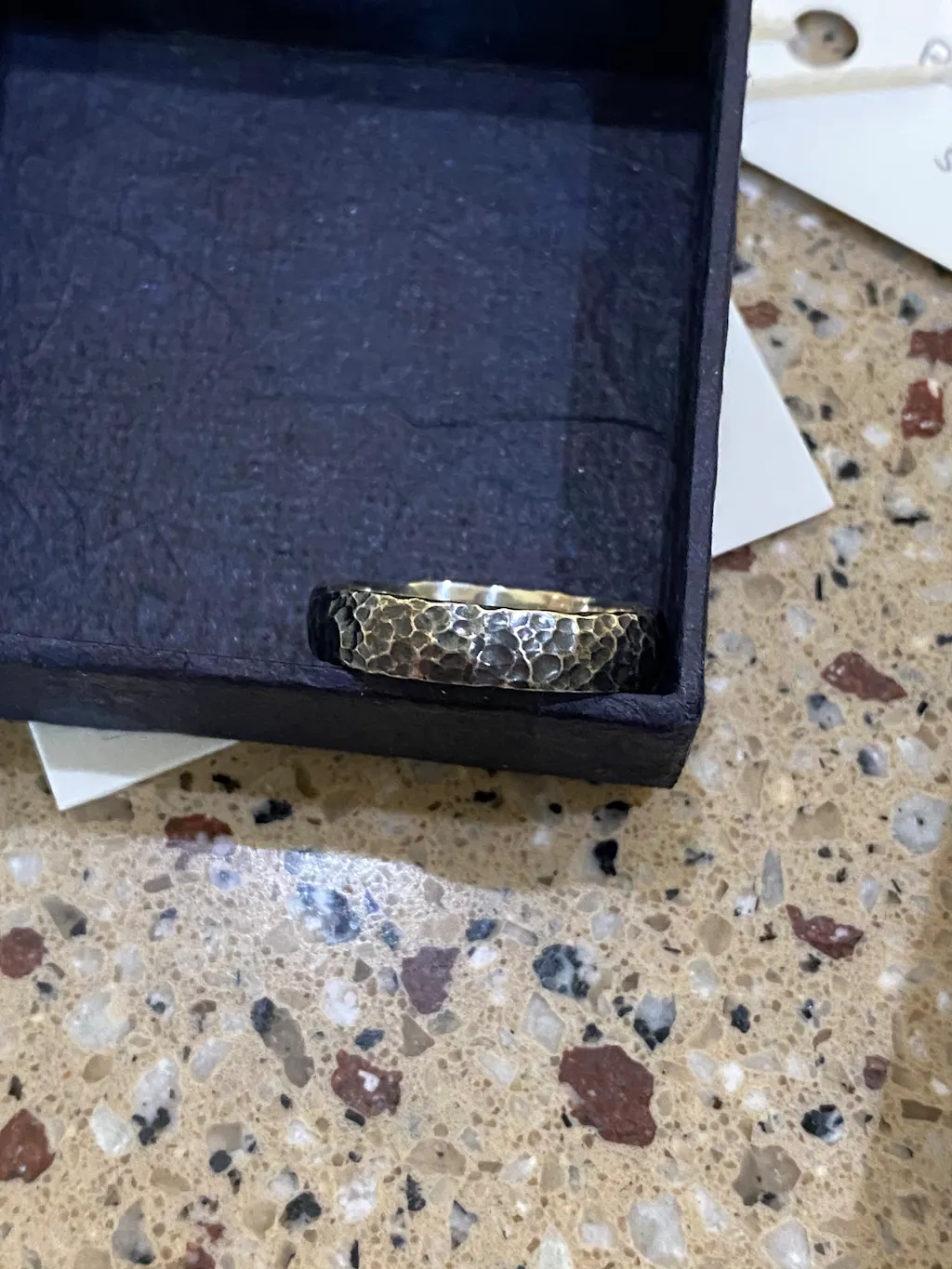 We use traditional metalsmithing techniques rather than wax carving, which means that we make our rings one by one, and that the dents are done by hand for each individual ring. The pattern on these wedding bands is random and has an organic feel to it. As a result, each pattern is completely unique. Kind of like your love story.