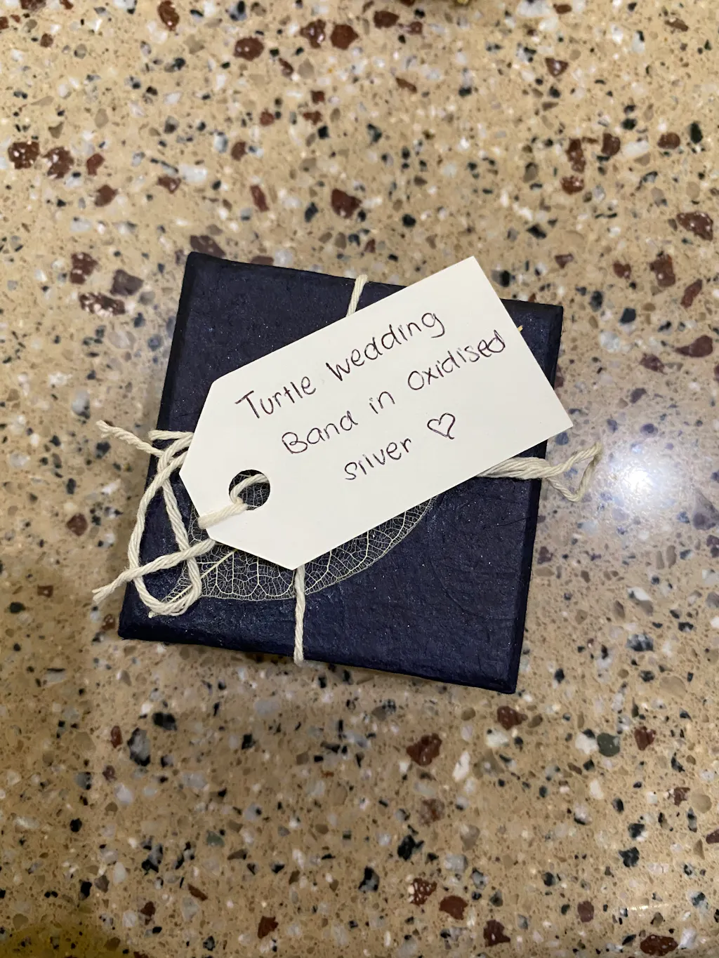 Choose from US size 4.25 (3 mm wide band) and US size 8 (4 mm wide band, with a tiny black diamond inside the band).